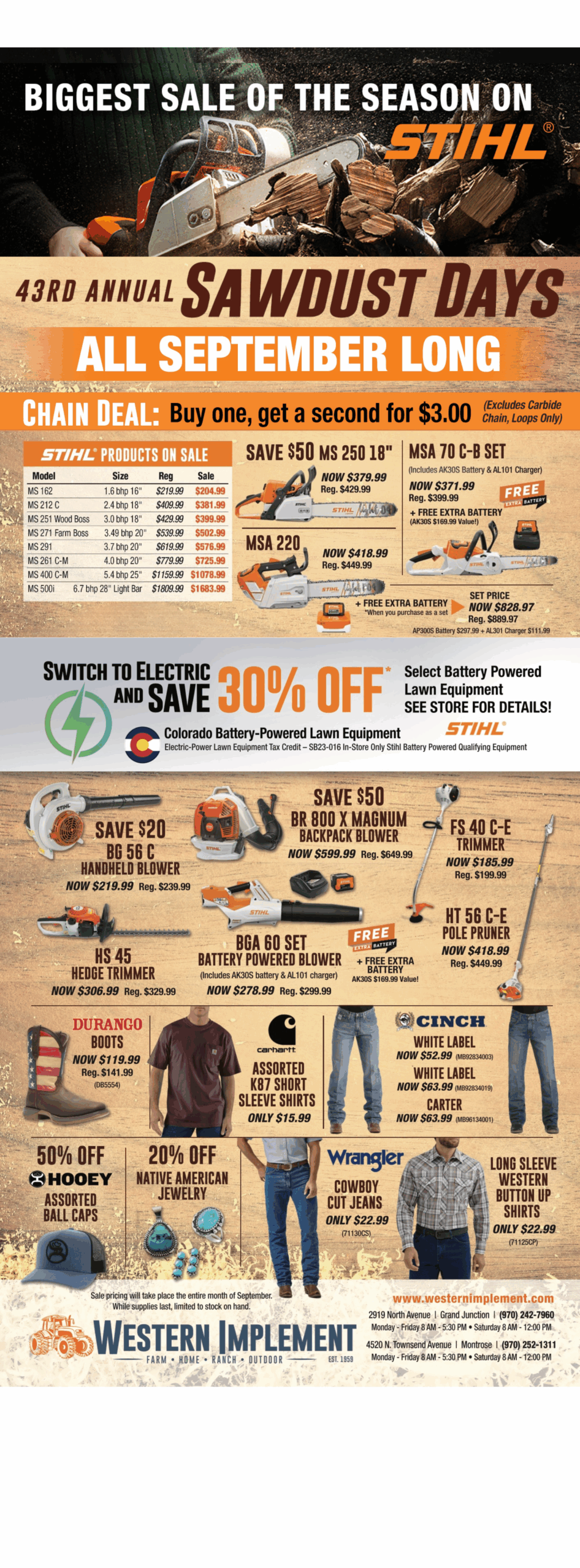 43rd Annual SawDust Days At Western Implement Friday, September 12th & Saturday September 13th Request More Information First Name Last Name Email Address Phone Questions? 6 + 15 = Submit